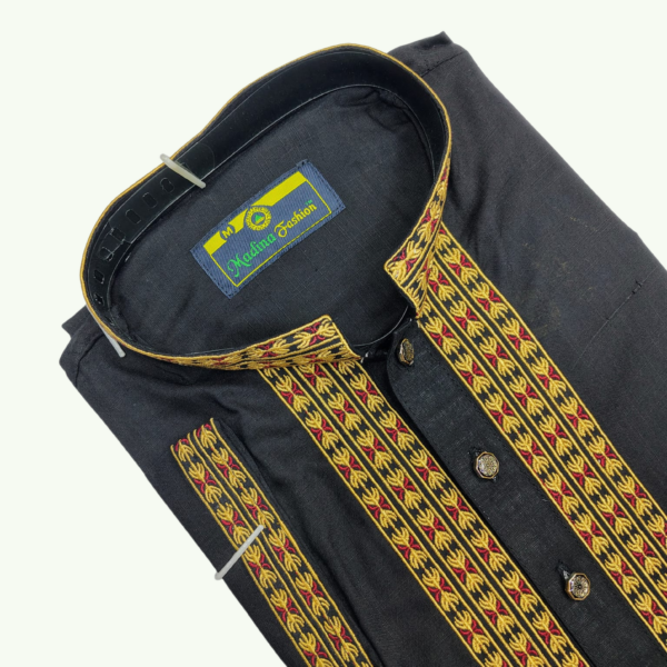 The Panjabi showcases an elegant woven chest panel that enhances its royal character, while the premium show buttons add a distinctive statement finish. Thoughtfully designed handcuff-style sleeves bring a structured, polished look, making it perfect for festive gatherings, cultural events, evening occasions, or refined everyday wear.